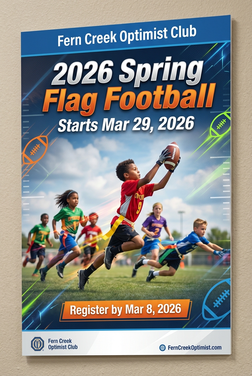 Fern Creek Optimist Club's 2026 Spring Flag Football season offers boys and girls a fun, safe introduction to football fundamentals, teamwork, and sportsmanship. Coached by local volunteers, the program features age-appropriate practices and weekend games that build confidence and keep kids active. Join us for a friendly, community-focused season where every player gets playing time and support.