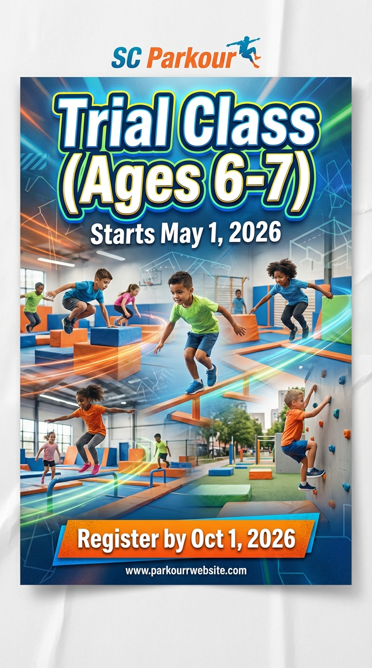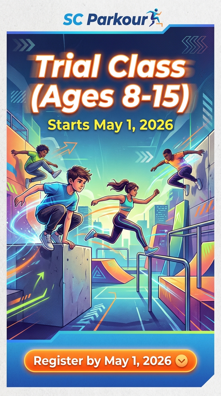 Give your child a fun, confidence-building introduction to parkour in this one-time trial class for ages 8–15. Our experienced coaches teach safe landing, vaulting, and movement skills in a supportive, small-group setting so kids can try new challenges and see if the sport is a fit. Perfect for beginners — no experience required.